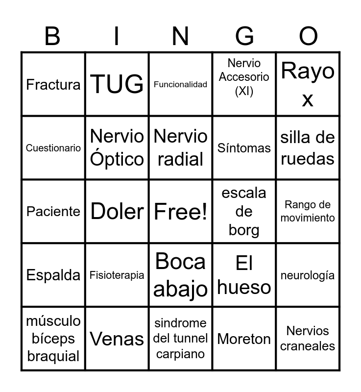 This bingo card has a free space and 25 words: Espalda, Venas, sindrome del tunnel carpiano, Moreton, Rayo x, Fractura, TUG, Funcionalidad, escala de borg, neurología, Cuestionario, Nervio Óptico, columna vertebral, El hueso, silla de ruedas, músculo bíceps braquial, Doler, Nervio radial, Síntomas, Rango de movimiento, Paciente, Fisioterapia, Boca abajo, Nervio Accesorio (XI) and Nervios craneales.