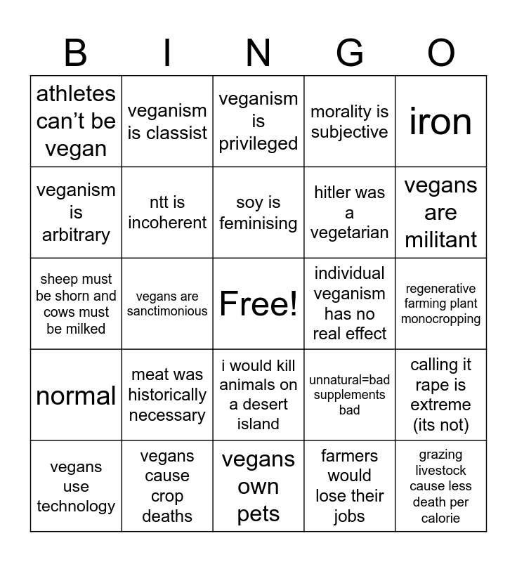 This bingo card has a free space and 101 words: im not vegan because vegans are annoying, vegan diets are deficient in protein, iron, vitamin d, vitamin a, omega 3, epa, dha, zinc, iodine, choline, b12, taurine and selenium, not a single tribe was vegan, our ancestors ate meat, meat is necessary, normal, nice and natural, humans are at the top of the food chain, humans are apex predators, humans are omnivores, meat made our brains grow, meat made us human, animals cannot reciprocate the social contract, vegans are malnourished, vegans are militant, morality is subjective, meat was historically necessary, animals kill other animals, veganism is expensive, veganism is classist, veganism is privileged, a vegan world is unrealistic, i don’t kill the animal, one person won’t make a difference, i would kill animals on a desert island, farm animals would go extinct without carnivory, vegans are hippies, farmers would lose their jobs, vegans own pets, vegans use snake venom and modern medicine, vegans use technology, humane farming, plants feel pain, god permits carnivory, grazing livestock cause less death per calorie, free range, vegans care more about animals than humans, hunting invasive species yields a reduction in net suffering, veganism is a religion, fish are swimming vegetables, veganism is arbitrary, it's my personal choice, animals don't understand morality, bacon, farm animals wouldn't exist without us, veganism is restrictive, veganism maims culture, animal rights are a slippery slope, animal rights dehumanise us, ntt is incoherent, ntt is unsound, ntt is impotent against particularism, ntt presupposes bundle theory, ntt asumes morality is predicated on traits, hitler was a vegetarian, veganism is a cult, vegans are sanctimonious, vegans cause crop deaths, veganism murders babies, there are no long-term studies on veganism, the failure rate of veganism is 84%, athletes can’t be vegan, veganism is a government conspiracy, soy is feminising, sheep must be shorn and cows must be milked, years of tradition tho, vegans can't be healthy, grassfed only utopia farm though, backyard eggs/milk causes no harm, special meat nutrient myth, if we don't kill, they will overpopulate, individual veganism has no real effect, unmilked cows will explode, circle of life, your studies are biased (mine aren't tho), regenerative farming plant monocropping, 3rd world country? remote area, MEAT YUMMY, doesn't believe in demand affecting supply, unnatural=bad supplements bad, but it had a good life painless death tho, what about cars? cell phone? clothing?, God said its ok, crop deaths tho plant feelings tho, calling it rape is extreme (its not), it'd be wasted if we don't eat it, personal choice tho, canine evolution tho lions tho, aint readin allat, fr fr and stop forcing your views, i wont change.