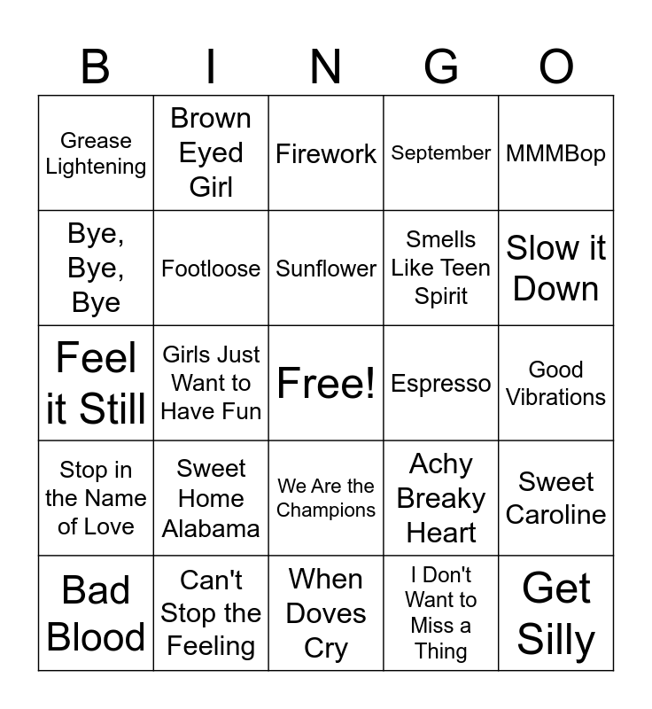 This bingo card has a free space and 24 words: Sweet Home Alabama, Can't Stop the Feeling, Sunflower, Bad Blood, MMMBop, Grease Lightening, Bye, Bye, Bye, Brown Eyed Girl, Espresso, We Are the Champions, Smells Like Teen Spirit, Feel it Still, Achy Breaky Heart, Sweet Caroline, Footloose, I Don't Want to Miss a Thing, Good Vibrations, Firework, Slow it Down, Girls Just Want to Have Fun, Get Silly, Stop in the Name of Love, September and When Doves Cry.