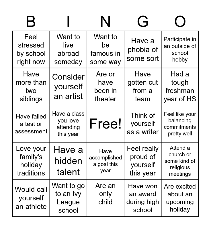 This bingo card has a free space and 24 words: Have a hidden talent, Want to go to an Ivy League school, Are or have been in theater, Would call yourself an athlete, Participate in an outside of school hobby, Feel stressed by school right now, Have more than two siblings, Want to live abroad someday, Think of yourself as a writer, Have accomplished a goal this year, Have gotten cut from a team, Have failed a test or assessment, Feel really proud of yourself this year, Attend a church or some kind of religious meetings, Consider yourself an artist, Have won an award during high school, Feel like your balancing commitments pretty well, Want to be famous in some way, Had a tough freshman year of HS, Have a class you love attending this year, Are excited about an upcoming holiday, Love your family's holiday traditions, Have a phobia of some sort and Are an only child.