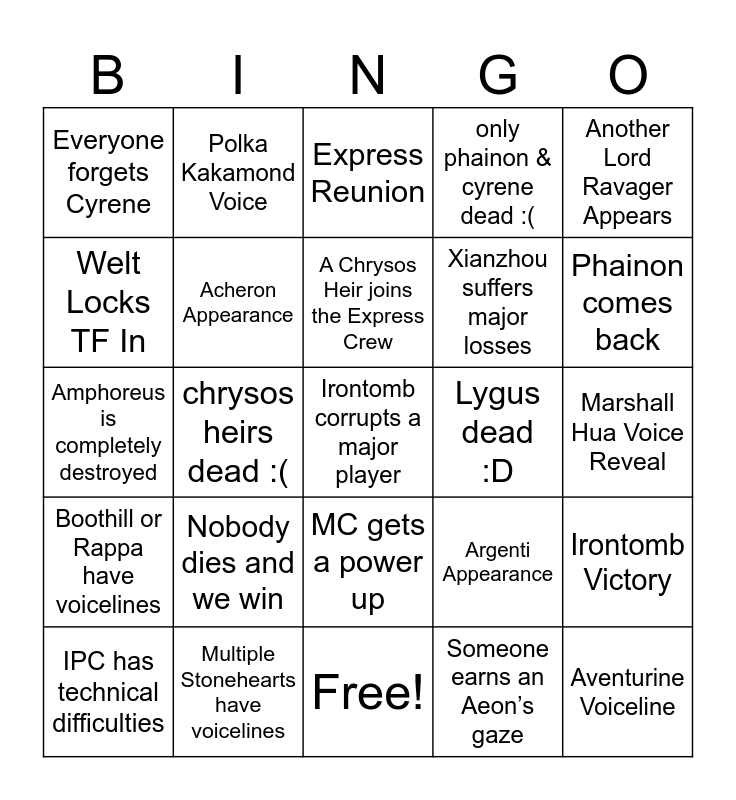 This bingo card has 25 words: Boothill or Rappa have voicelines, Multiple Stonehearts have voicelines, Irontomb corrupts a major player, Someone earns an Aeon’s gaze, Another Lord Ravager Appears, Everyone forgets Cyrene, Polka Kakamond Voice, Express Reunion, Lygus dead :D, Irontomb Victory, Welt Locks TF In, Acheron Appearance, Free!, Argenti Appearance, Phainon comes back, IPC has technical difficulties, chrysos heirs dead :(, A Chrysos Heir joins the Express Crew, Xianzhou suffers major losses, Marshall Hua Voice Reveal, Amphoreus is completely destroyed, Nobody dies and we win, MC gets a power up, only phainon & cyrene dead :( and Aventurine Voiceline.