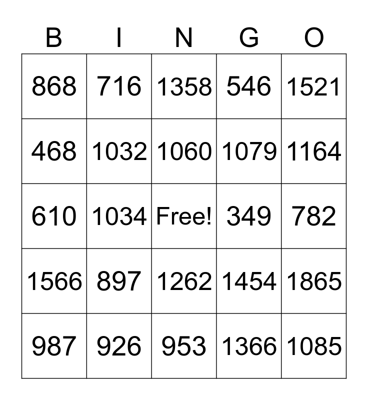 This bingo card has a free space and 24 words: 987, 897, 1060, 1366, 1521, 868, 716, 1358, 349, 782, 610, 1032, 1454, 1865, 468, 926, 953, 546, 1164, 1566, 1034, 1262, 1079 and 1085.