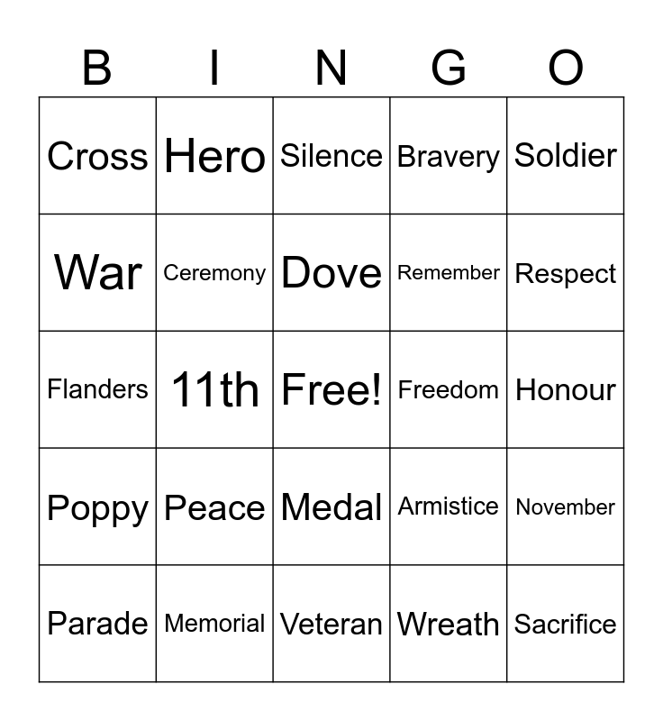 This bingo card has a free space and 24 words: Peace, Memorial, Dove, Parade, Soldier, Cross, War, Hero, Freedom, Medal, Remember, Flanders, Armistice, November, Ceremony, Wreath, Honour, Silence, Respect, 11th, Sacrifice, Poppy, Bravery and Veteran.