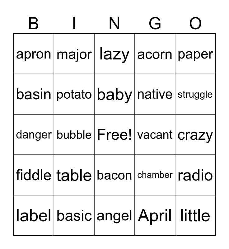 This bingo card has a free space and 24 words: table, basic, baby, label, paper, apron, basin, major, vacant, bacon, native, danger, chamber, radio, potato, April, crazy, lazy, struggle, bubble, little, fiddle, acorn and angel.