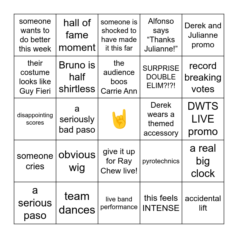 This bingo card has a free space and 24 words: obvious wig, team dances, the audience boos Carrie Ann, a serious paso, Derek and Julianne promo, someone wants to do better this week, their costume looks like Guy Fieri, hall of fame moment, Derek wears a themed accessory, give it up for Ray Chew live!, SURPRISE DOUBLE ELIM?!?!, disappointing scores, pyrotechnics, a real big clock, Bruno is half shirtless, this feels INTENSE, DWTS LIVE promo, someone is shocked to have made it this far, record breaking votes, a seriously bad paso, accidental lift, someone cries, Alfonso says “Thanks Julianne!” and live band performance.