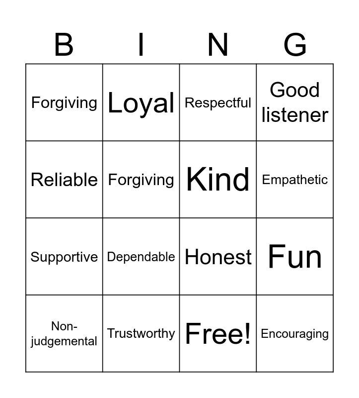 This bingo card has 17 words: Free!, Non-judgemental, Respectful, Forgiving, Dependable, Good listener, Fun, Kind, Empathetic, Forgiving, Trustworthy, Honest, Reliable, Loyal, Supportive, Caring and Encouraging.