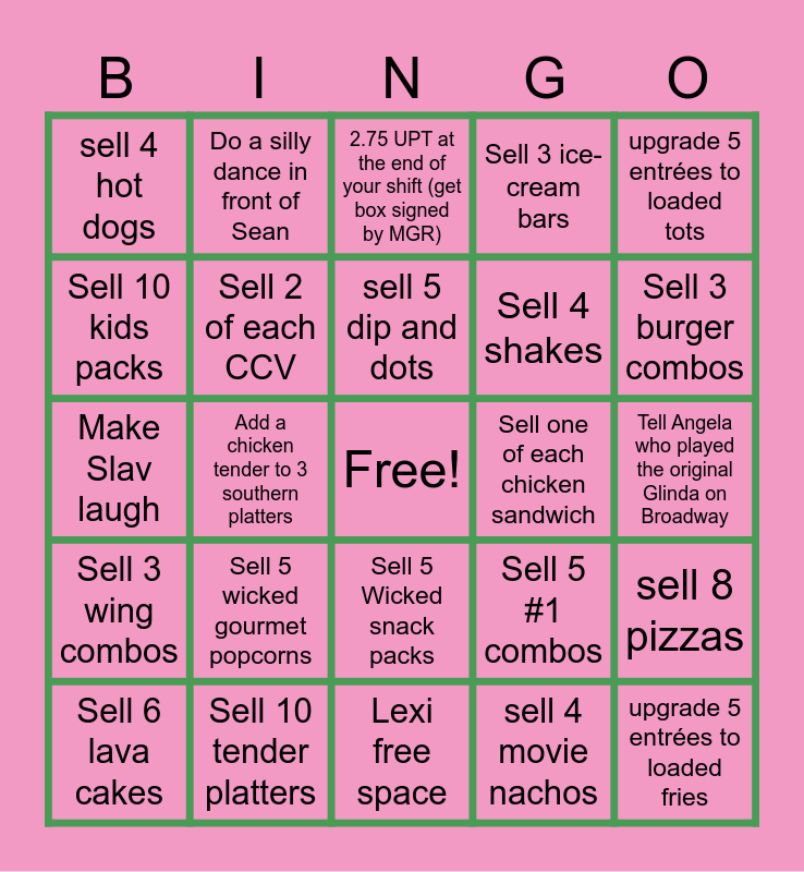 This bingo card has a free space and 24 words: Sell 5 wicked gourmet popcorns, Sell 10 tender platters, sell 5 dip and dots, Sell 6 lava cakes, upgrade 5 entrées to loaded tots, sell 4 hot dogs, Sell 10 kids packs, Do a silly dance in front of Sean, Sell one of each chicken sandwich, Sell 5 Wicked snack packs, Sell 4 shakes, Make Slav laugh, Sell 5 #1 combos, sell 8 pizzas, Sell 2 of each CCV, sell 4 movie nachos, Tell Angela who played the original Glinda on Broadway, 2.75 UPT at the end of your shift (get box signed by MGR), Sell 3 burger combos, Add a chicken tender to 3 southern platters, upgrade 5 entrées to loaded fries, Sell 3 wing combos, Sell 3 ice-cream bars and Lexi free space.