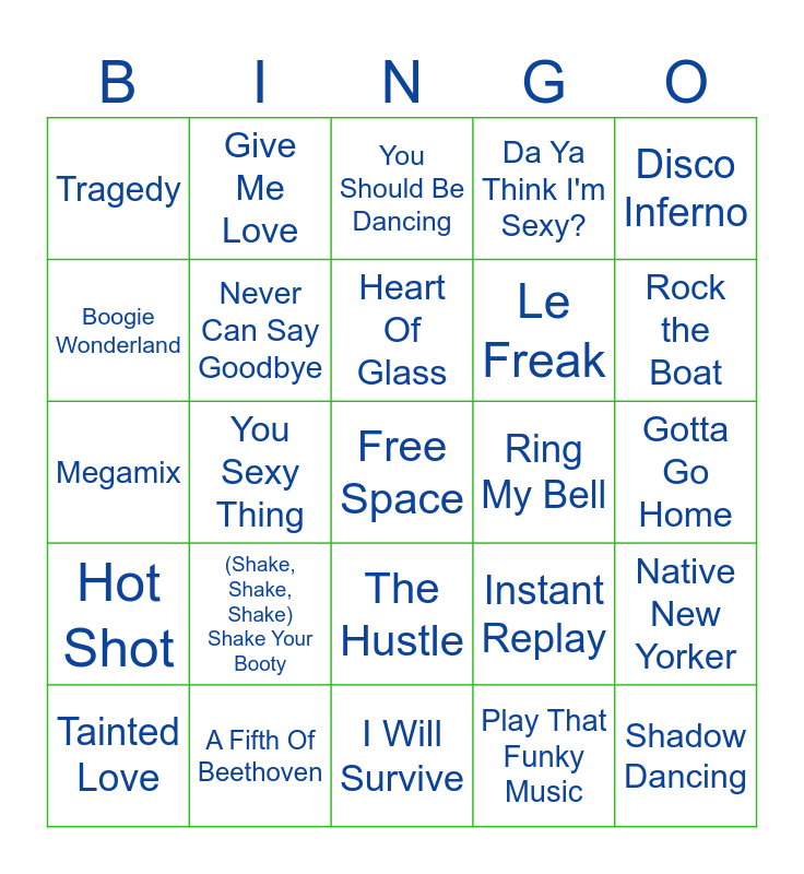 This bingo card has a free space and 74 words: I Was Made For Dancin', I Feel Love, Heart Of Glass, Chase, Video Killed The Radio Star, Escape (The Pina Colada Song), Bad Girls, Magic Fly, Carry On, Turn Me On, Pop Muzik, Tainted Love, Please Don't Go, Le Freak, Disco Inferno, Grease, A Fifth Of Beethoven, Hot Stuff, Ring My Bell, He's the Greatest Dancer, Tragedy, You Sexy Thing, You Should Be Dancing, Da Ya Think I'm Sexy?, Gotta Go Home, Boogie Wonderland, In the Stone, Good Times, Get Up and Boogie-That's Right, Street Player, Born to Be Alive, Never Can Say Goodbye, That's the Way (I Like It), Last Train to London, It Only Takes A Minute, Lady Marmalade, Let's All Chant, Fantasy, You're The First, The Last, My Everything, Shadow Dancing, Spacer, Reach Out, I'll Be There, The Hustle, Doctor's Orders, Keep On Jumpin', Rapper's Delight, Give Me Love, Pick Me Up, I'll Dance, Macho Man, YMCA, Do It Any Way You Wanna, Boogie Oogie Oogie, Dance With Me, Instant Replay, Sunny, Don't Take Away The Music, Fly Robin Fly, I Will Survive, Shake Your Body (Down to the Ground), Don't Let Go, Hot Shot, (Shake, Shake, Shake) Shake Your Booty, December, 1963 (Oh What a Night), Play That Funky Music, Native New Yorker, Megamix, Yes, Sir I Can Boogie, Night Fever, Stayin Alive, Rock the Boat, Turn The Beat Around, Dancing Queen, Gimme! Gimme! Gimme! (A Man After Midnight), Mamma Mia and We Are Family.
