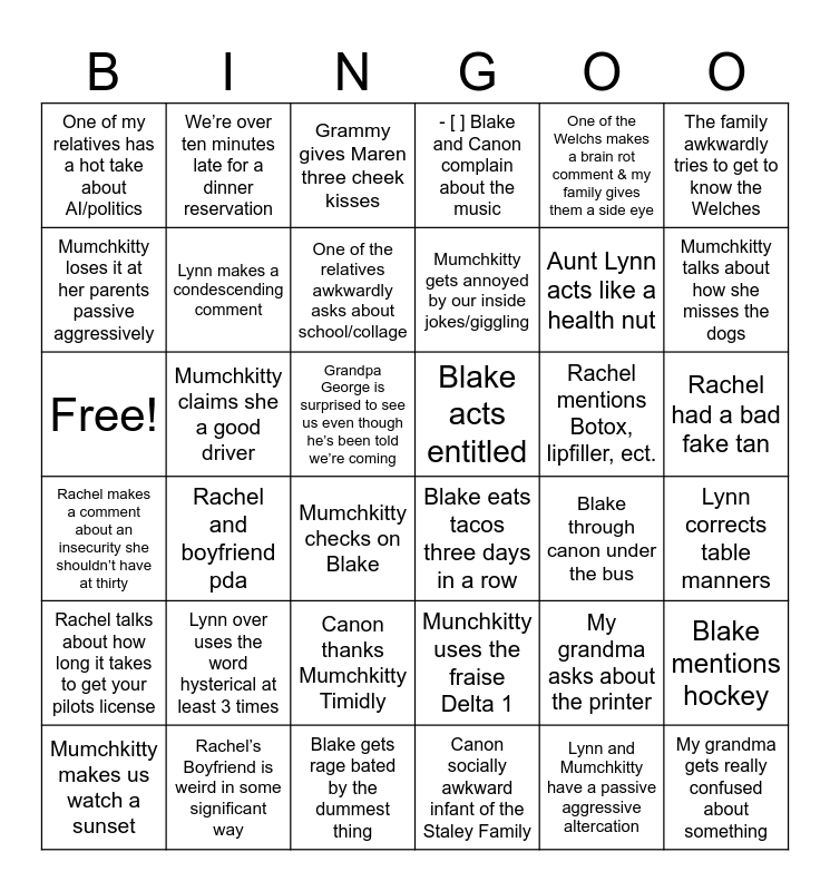 This bingo card has 36 words: Munchkitty uses the fraise Delta 1, Canon thanks Mumchkitty Timidly, Canon socially awkward infant of the Staley Family, Mumchkitty loses it at her parents passive aggressively, Rachel makes a comment about an insecurity she shouldn’t have at thirty, Blake acts entitled, Lynn makes a condescending comment, Blake gets rage bated by the dummest thing, One of the Welchs makes a brain rot comment & my family gives them a side eye, My grandma asks about the printer, Mumchkitty talks about how she misses the dogs, - [ ] Blake and Canon complain about the music, Blake mentions hockey, Mumchkitty claims she a good driver, Mumchkitty gets annoyed by our inside jokes/giggling, One of my relatives has a hot take about AI/politics, Rachel talks about how long it takes to get your pilots license, Rachel mentions Botox, lipfiller, ect., Free!, Grammy gives Maren three cheek kisses, Grandpa George is surprised to see us even though he’s been told we’re coming, Rachel and boyfriend pda, Blake eats tacos three days in a row, Mumchkitty checks on Blake, Blake through canon under the bus, We’re over ten minutes late for a dinner reservation, Aunt Lynn acts like a health nut, Rachel’s Boyfriend is weird in some significant way, One of the relatives awkwardly asks about school/collage, The family awkwardly tries to get to know the Welches, My grandma gets really confused about something, Mumchkitty makes us watch a sunset, Lynn corrects table manners, Rachel had a bad fake tan, Lynn over uses the word hysterical at least 3 times and Lynn and Mumchkitty have a passive aggressive altercation.