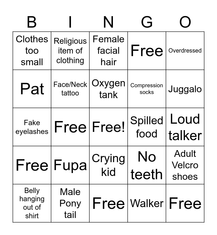 This bingo card has a free space and 24 words: Fupa, Male Pony tail, Oxygen tank, Belly hanging out of shirt, Overdressed, Clothes too small, Pat, Religious item of clothing, Spilled food, Crying kid, Compression socks, Fake eyelashes, No teeth, Adult Velcro shoes, Face/Neck tattoo, Walker, Loud talker, Female facial hair, Juggalo, Free, Free, Free, Free and Free.