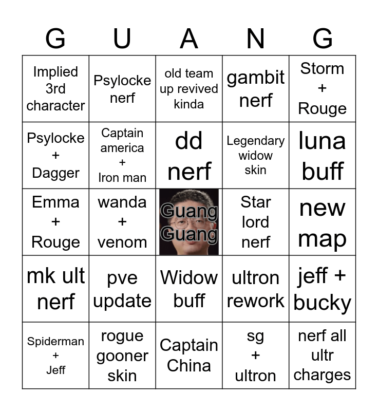 This bingo card has a free space and 24 words: pve update, rogue gooner skin, dd nerf, Spiderman + Jeff, Storm + Rouge, Implied 3rd character, Psylocke + Dagger, Psylocke nerf, Star lord nerf, Widow buff, Legendary widow skin, Emma + Rouge, ultron rework, jeff + bucky, Captain america + Iron man, sg + ultron, new map, old team up revived kinda, luna buff, wanda + venom, nerf all ultr charges, mk ult nerf, gambit nerf and Captain China.