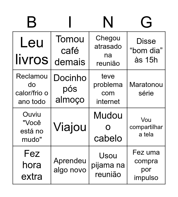 This bingo card has 16 words: Aprendeu algo novo, Vou compartilhar a tela, Chegou atrasado na reunião, Leu livros, Ouviu "Você está no mudo", Tomou café demais, Mudou o cabelo, Usou pijama na reunião, Reclamou do calor/frio o ano todo, Docinho pós almoço, Fez hora extra, Disse “bom dia” às 15h, Viajou, Maratonou série, teve problema com internet and Fez uma compra por impulso.