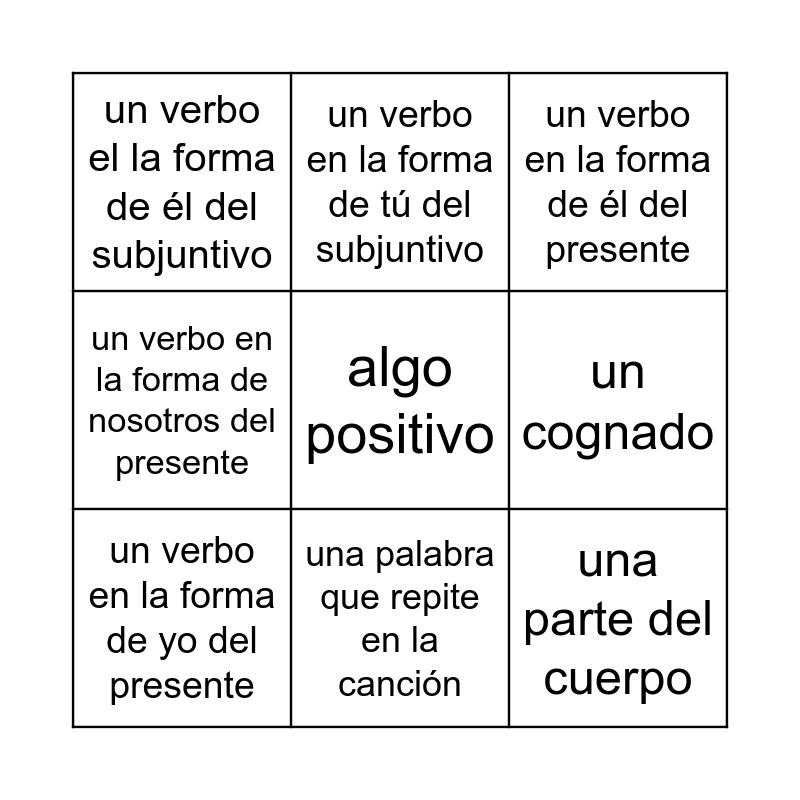 This bingo card has 9 words: un verbo en la forma de yo del presente, un verbo en la forma de él del presente, un verbo en la forma de tú del subjuntivo, un verbo en la forma de nosotros del presente, un verbo el la forma de él del subjuntivo, un cognado, algo positivo, una parte del cuerpo and una palabra que repite en la canción.