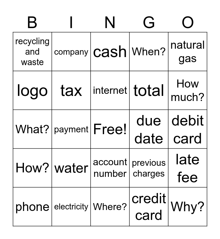 This bingo card has a free space and 24 words: water, electricity, internet, phone, natural gas, recycling and waste, logo, company, due date, account number, total, What?, previous charges, late fee, tax, credit card, debit card, cash, How much?, payment, Why?, How?, When? and Where?.