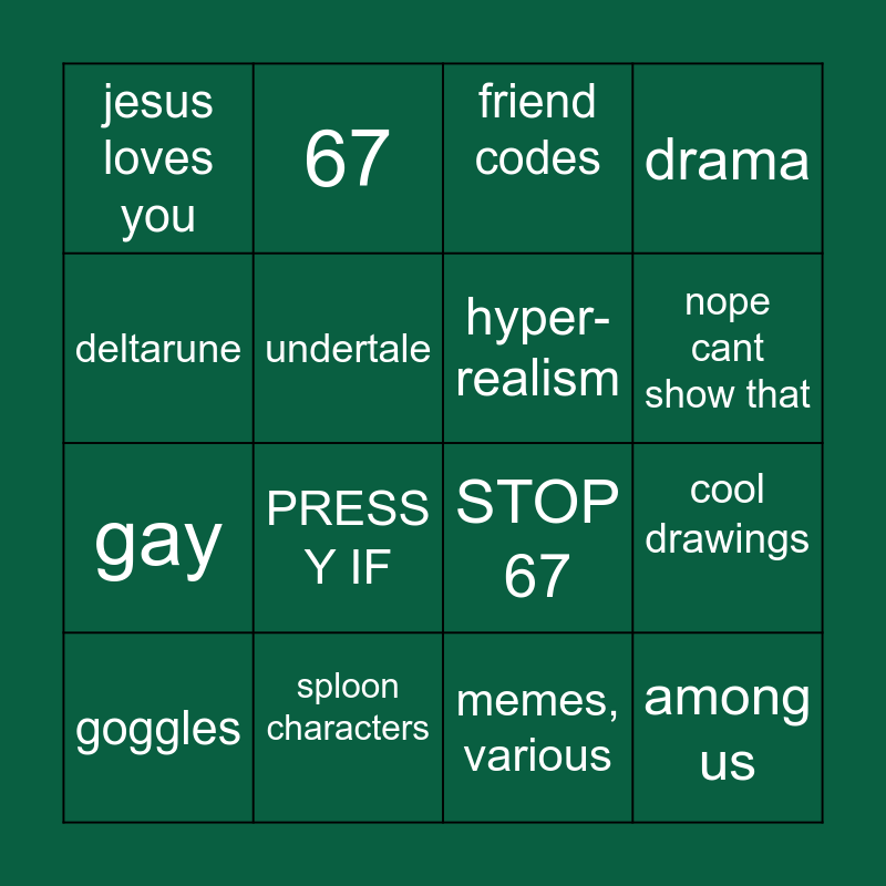 This bingo card has 16 words: sploon characters, cool drawings, friend codes, jesus loves you, gay, 67, STOP 67, memes, various, deltarune, undertale, goggles, drama, PRESS Y IF, nope cant show that, hyper-realism and among us.