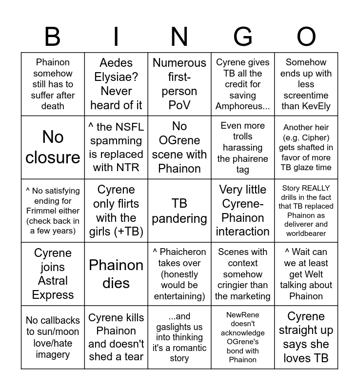 This bingo card has a free space and 24 words: Phainon dies, Cyrene kills Phainon and doesn't shed a tear, No OGrene scene with Phainon, No callbacks to sun/moon love/hate imagery, Somehow ends up with less screentime than KevEly, Phainon somehow still has to suffer after death, No closure, Aedes Elysiae? Never heard of it, Very little Cyrene-Phainon interaction, ^ Phaicheron takes over (honestly would be entertaining), Even more trolls harassing the phairene tag, ^ No satisfying ending for Frimmel either (check back in a few years), Scenes with context somehow cringier than the marketing, ^ Wait can we at least get Welt talking about Phainon, ^ the NSFL spamming is replaced with NTR, NewRene doesn't acknowledge OGrene's bond with Phainon, Story REALLY drills in the fact that TB replaced Phainon as deliverer and worldbearer, Numerous first-person PoV, Another heir (e.g. Cipher) gets shafted in favor of more TB glaze time, Cyrene only flirts with the girls (+TB), Cyrene straight up says she loves TB, Cyrene joins Astral Express, Cyrene gives TB all the credit for saving Amphoreus... and ...and gaslights us into thinking it's a romantic story.