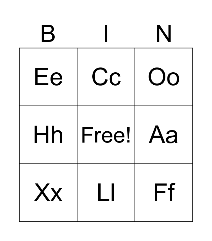 This bingo card has a free space and 8 words: Aa, Oo, Cc, Xx, Ee, Ff, Hh and Ll.