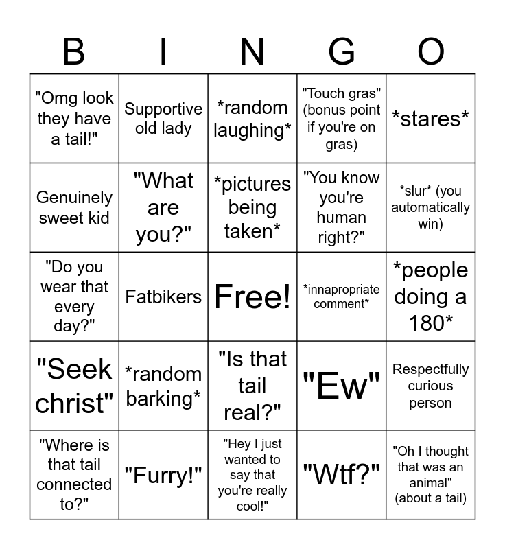 This bingo card has a free space and 24 words: *random barking*, "Furry!", *pictures being taken*, "Where is that tail connected to?", *stares*, "Omg look they have a tail!", Genuinely sweet kid, Supportive old lady, *innapropriate comment*, "Is that tail real?", "You know you're human right?", "Do you wear that every day?", "Ew", Respectfully curious person, "What are you?", "Wtf?", *people doing a 180*, *random laughing*, *slur* (you automatically win), Fatbikers, "Oh I thought that was an animal" (about a tail), "Seek christ", "Touch gras" (bonus point if you're on gras) and "Hey I just wanted to say that you're really cool!".