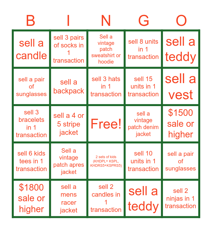 This bingo card has a free space and 24 words: Sell a vintage patch apres jacket, sell a mens racer jacket, sell 3 hats in 1 transaction, $1800 sale or higher, sell a teddy, sell a candle, sell a pair of sunglasses, sell 3 pairs of socks in 1 transaction, sell a vintage patch denim jacket, 2 sets of kids (KHDPL+ KSPL, KHDRS5+KSPRS5), sell 15 units in 1 transaction, sell 3 bracelets in 1 transaction, sell 10 units in 1 transaction, sell a pair of sunglasses, sell a backpack, sell a teddy, $1500 sale or higher, Sell a vintage patch sweatshirt or hoodie, sell a vest, sell a 4 or 5 stripe jacket, sell 2 ninjas in 1 transaction, sell 6 kids tees in 1 transaction, sell 8 units in 1 transaction and sell 2 candles in 1 transaction.