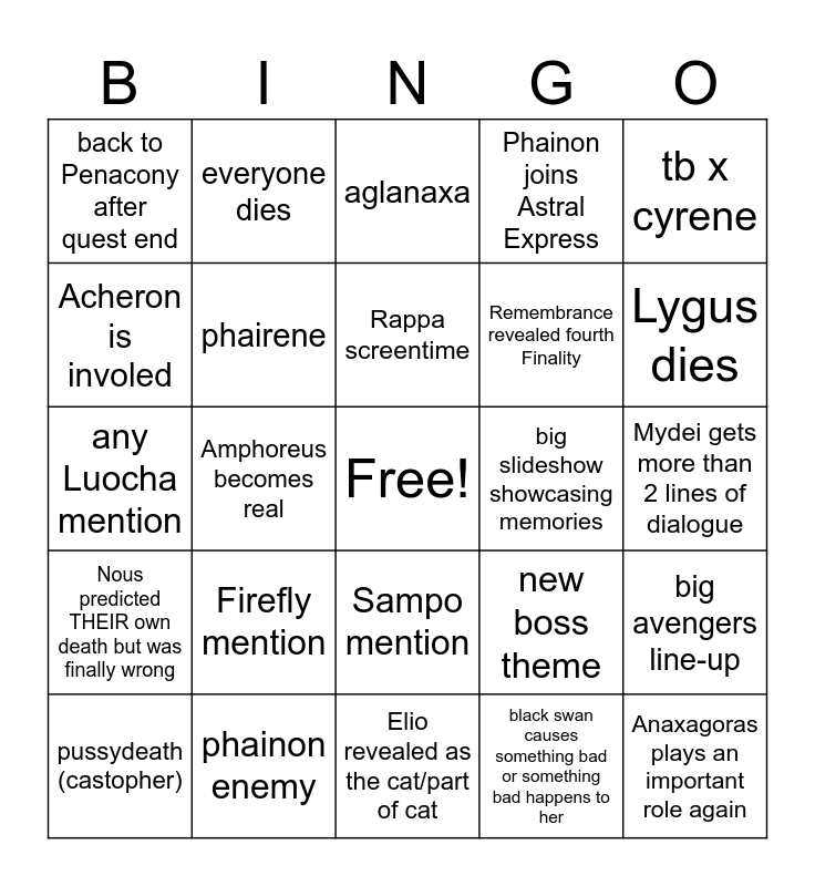 This bingo card has a free space and 24 words: Firefly mention, phainon enemy, Rappa screentime, pussydeath (castopher), tb x cyrene, back to Penacony after quest end, Acheron is involed, everyone dies, big slideshow showcasing memories, Sampo mention, Remembrance revealed fourth Finality, any Luocha mention, new boss theme, big avengers line-up, phairene, black swan causes something bad or something bad happens to her, Mydei gets more than 2 lines of dialogue, aglanaxa, Lygus dies, Amphoreus becomes real, Anaxagoras plays an important role again, Nous predicted THEIR own death but was finally wrong, Phainon joins Astral Express and Elio revealed as the cat/part of cat.