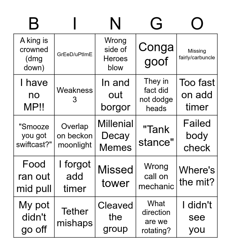 This bingo card has a free space and 24 words: I forgot add timer, Tether mishaps, In and out borgor, My pot didn't go off, Missing fairly/carbuncle, A king is crowned (dmg down), I have no MP!!, GrEeD/uPtImE, "Tank stance", Missed tower, They in fact did not dodge heads, "Smooze you got swiftcast?", Wrong call on mechanic, Where's the mit?, Weakness 3, What direction are we rotating?, Failed body check, Wrong side of Heroes blow, Too fast on add timer, Overlap on beckon moonlight, I didn't see you, Food ran out mid pull, Conga goof and Cleaved the group.