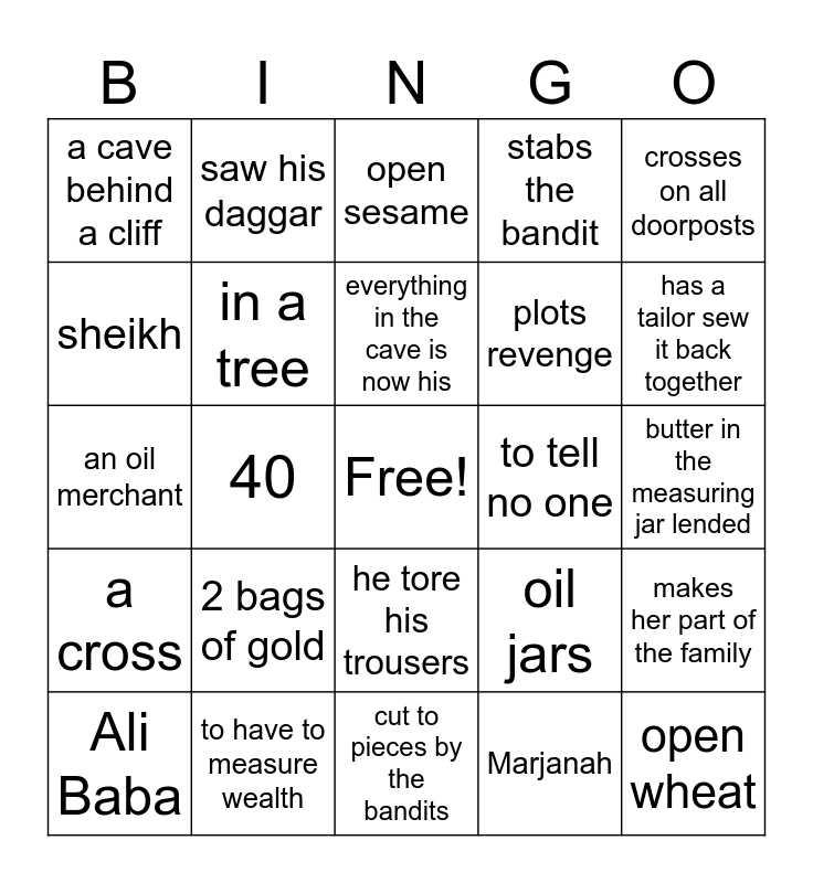 This bingo card has a free space and 29 words: Ali Baba, Kasim, 40, as black as their beards, a cave behind a cliff, open sesame, in a tree, 2 bags of gold, to tell no one, to have to measure wealth, butter in the measuring jar lended, open wheat, cut to pieces by the bandits, Marjanah, has a tailor sew it back together, the body is no longer there, he tore his trousers, a cross, crosses on all doorposts, an oil merchant, oil jars, air holes plugged with cream cheese, plots revenge, sheikh, stabs the bandit, saw his daggar, makes her part of the family, everything in the cave is now his and a dervish.