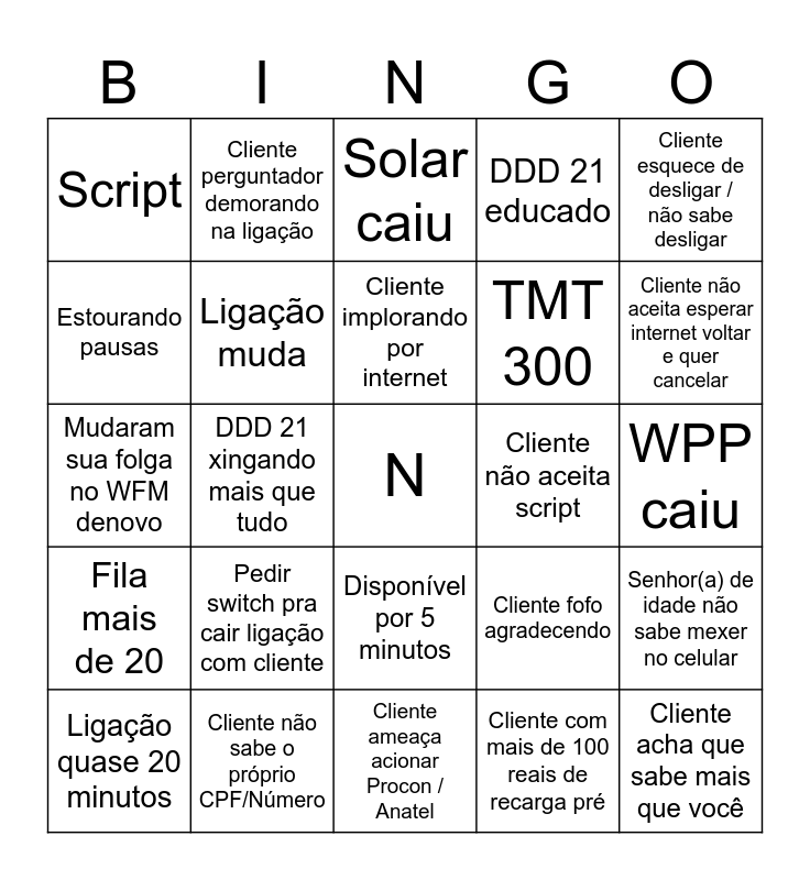 This bingo card has a free space and 29 words: Ligação quase 20 minutos, Cliente reclamando de centavos, DDD 21 xingando mais que tudo, Supervisor(a) sumiu, Script, Solar caiu, Ligação muda, Pedir switch pra cair ligação com cliente, Cliente não aceita script, Cliente não sabe o próprio CPF/Número, WPP caiu, Cliente acha que sabe mais que você, Cliente ameaça acionar Procon / Anatel, Cliente com mais de 100 reais de recarga pré, Cliente não aceita esperar internet voltar e quer cancelar, Cliente BURRO tem que explicar mais de 100 vezes, Disponível por 5 minutos, Fila mais de 20, Cliente esquece de desligar / não sabe desligar, Mudaram sua folga no WFM denovo, Cliente fofo agradecendo, Supervisor(a) de folga, TMT 300, Estourando pausas, DDD 21 educado, Cliente perguntador demorando na ligação, Senhor(a) de idade não sabe mexer no celular, Cliente implorando por internet and Cliente quer falar com supervisor.