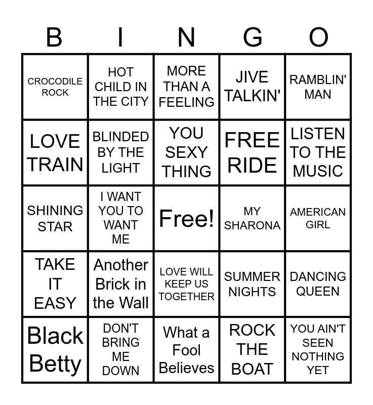 This bingo card has a free space and 62 words: YOU'RE THE ONE THAT I WANT, WILD WORLD, EASY, SUMMER NIGHTS, DANCING QUEEN, BRICK HOUSE, I WANT YOU TO WANT ME, PARADISE BY THE DASHBOARD LIGHT, MY SHARONA, DECEMBER 1963 (OH WHAT A NIGHT), CROCODILE ROCK, AFTERNOON DELIGHT, FREE RIDE, YOU AIN'T SEEN NOTHING YET, DON'T STOP, HOT CHILD IN THE CITY, YOU SEXY THING, JIVE TALKIN', ESCAPE (THE PINA COLADA SONG), LOVE TRAIN, DON'T BRING ME DOWN, MORE THAN A FEELING, TAKE A CHANCE ON ME, AMERICAN GIRL, ONLY THE GOOD DIE YOUNG, THAT'S THE WAY I LIKE IT, LOVE WILL KEEP US TOGETHER, CECELIA, LISTEN TO THE MUSIC, Big Yellow Taxi, HOOKED ON A FEELING, IN THE SUMMERTIME, STUCK IN THE MIDDLE WITH YOU, PROMISED LAND, TAKE IT EASY, BLINDED BY THE LIGHT, Dancing Queen, SIGNED SEALED DELIVERED I'M YOURS, RAMBLIN' MAN, Black Betty, Another Brick in the Wall, SHE'S A LADY, ROCK THE BOAT, UP AROUND THE BEND, SHINING STAR, BORN TO RUN, CAT'S IN THE CRADLE, LOW RIDER, STAYIN' ALIVE, BURNING LOVE, Let it Be, What a Fool Believes, Three Times a Lady, Close to You, Brown Eyed Girl, American Pie, Crocodile Rock, If you Want to Sing Out, Sing Out, Listen to the Music, Take Me Home Country Roads, Jolene and Don't Make My Brown Eyes Blue.