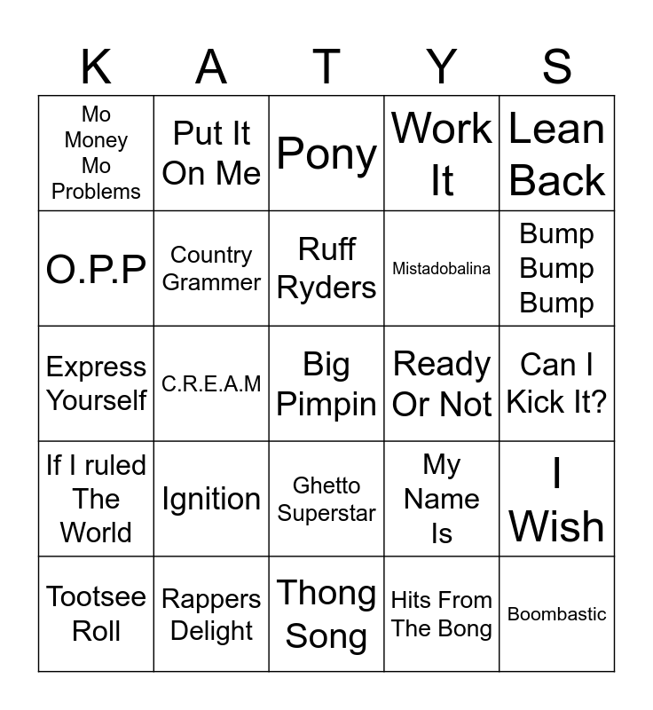 This bingo card has 35 words: Hypnotize, Back That A** UP, In Da Club, Country Grammer, Ghetto Superstar, Work It, O.P.P, Let Me Blow Ya Mind, Ruff Ryders, Area Codes, Express Yourself, Lean Back, Intergalactic, The Humpty Dance, Mo Money Mo Problems, Ready Or Not, Hits From The Bong, C.R.E.A.M, If I ruled The World, Big Pimpin, My Name Is, Tootsee Roll, I Wish, Rappers Delight, Pony, Bump Bump Bump, Boombastic, Rosa Parks, Mistadobalina, Can I Kick It?, Killing Me Softly, Thong Song, Ignition, Put It On Me and Where Da party At?.