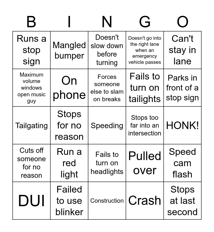 This bingo card has a free space and 24 words: Run a red light, Failed to use blinker, Forces someone else to slam on breaks, DUI, Can't stay in lane, Runs a stop sign, Maximum volume windows open music guy, Mangled bumper, Stops too far into an intersection, Fails to turn on headlights, Fails to turn on tailights, Tailgating, Pulled over, Speed cam flash, On phone, Crash, HONK!, Doesn't slow down before turning, Parks in front of a stop sign, Stops for no reason, Stops at last second, Cuts off someone for no reason, Doesn't go into the right lane when an emergency vehicle passes and Construction.