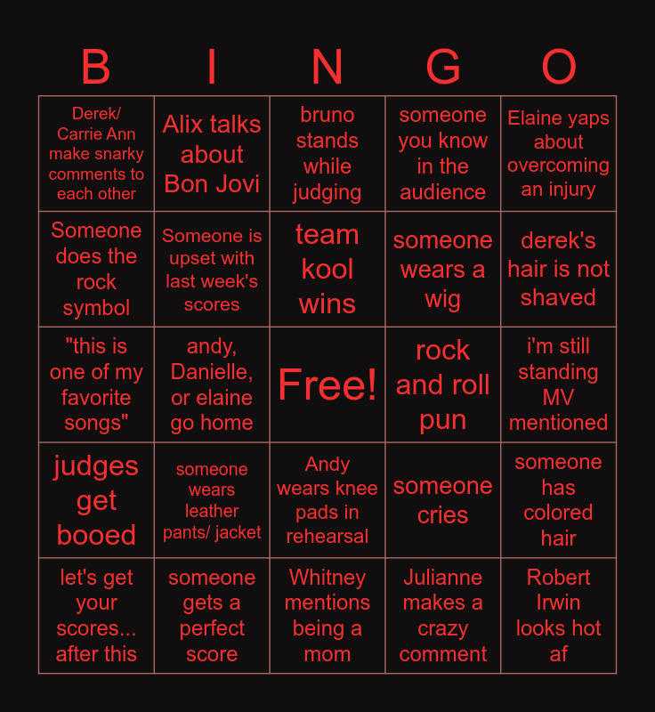 This bingo card has a free space and 24 words: someone wears leather pants/ jacket, someone gets a perfect score, team kool wins, let's get your scores... after this, Elaine yaps about overcoming an injury, Derek/ Carrie Ann make snarky comments to each other, Someone does the rock symbol, Alix talks about Bon Jovi, rock and roll pun, Andy wears knee pads in rehearsal, someone wears a wig, "this is one of my favorite songs", someone cries, someone has colored hair, Someone is upset with last week's scores, Julianne makes a crazy comment, i'm still standing MV mentioned, bruno stands while judging, derek's hair is not shaved, andy, Danielle, or elaine go home, Robert Irwin looks hot af, judges get booed, someone you know in the audience and Whitney mentions being a mom.