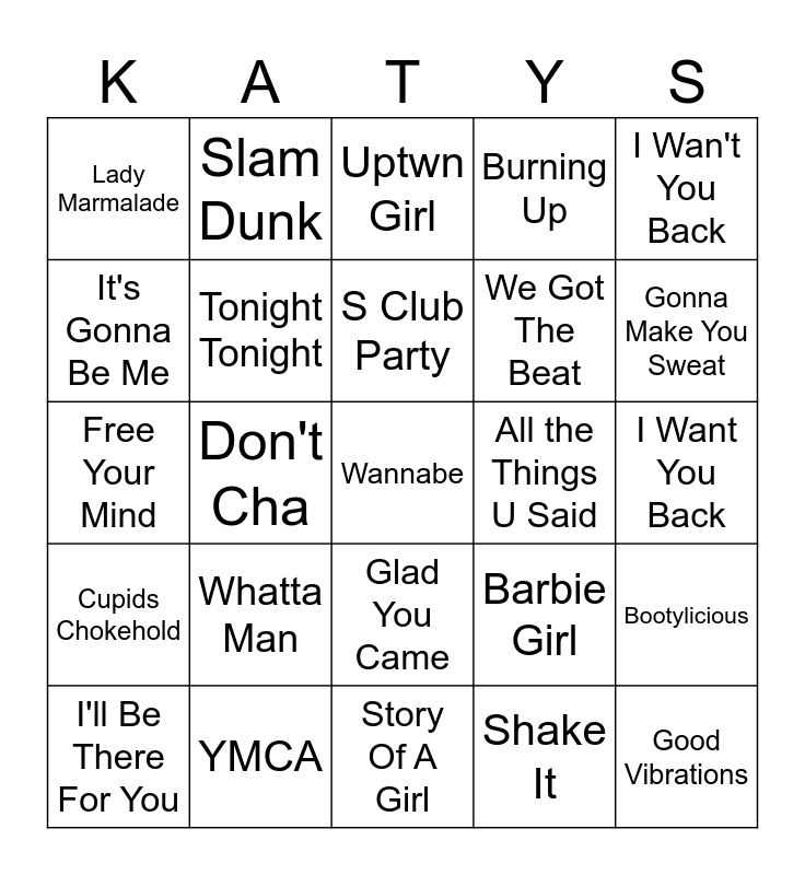 This bingo card has 35 words: MmmBop, Everybody, Candy Girl, Tonight Tonight, Glad You Came, Burning Up, It's Gonna Be Me, Motown Philly, S Club Party, Larger Than Life, Free Your Mind, I Wan't You Back, Jumpin Jumpin, Creep, Lady Marmalade, All the Things U Said, Shake It, Don't Cha, Cupids Chokehold, Wannabe, Barbie Girl, I'll Be There For You, Bootylicious, YMCA, Uptwn Girl, Gonna Make You Sweat, Good Vibrations, Boys In The Band, We Got The Beat, I Want You Back, Twist & Shout, Story Of A Girl, Whatta Man, Slam Dunk and C'est La Vie.