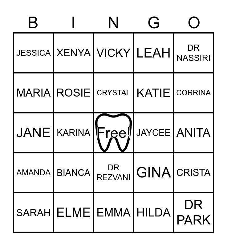 This bingo card has a free space and 27 words: GINA, SONIA, KATIE, EMMA, MARIA, VICKY, XENYA, AMANDA, JAYCEE, CRISTA, JANE, LEAH, SARAH, ELME, CORRINA, KENDRA, ROSIE, CRYSTAL, BIANCA, JESSICA, ANITA, HILDA, KARINA, DR PARK, DR REZVANI, DR NASSIRI and DR CAICEDO.