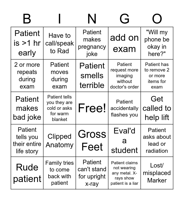 This bingo card has a free space and 24 words: Clipped Anatomy, Family tries to come back with patient, Patient smells terrible, Rude patient, "Will my phone be okay in here?", Patient is >1 hr early, 2 or more repeats during exam, Have to call/speak to Rad, Patient accidentally flashes you, Gross Feet, Patient request more imaging without doctor's order, Patient makes bad joke, Eval'd a student, Patient asks about lead or radiation, Patient moves during exam, Patient claims not wearing any metal. X-rays show patient is a liar, Get called to help lift, Patient makes pregnancy joke, Patient has to remove 2 or more items for exam, Patient tells you they are cold or asks for warm blanket, Lost/ misplaced Marker, Patient tells you their entire life story, add on exam and Patient can't stand for upright x-ray.