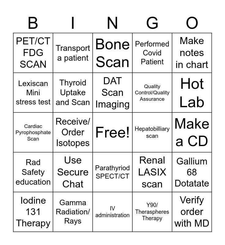 This bingo card has a free space and 24 words: Use Secure Chat, Gamma Radiation/ Rays, DAT Scan Imaging, Iodine 131 Therapy, Make notes in chart, PET/CT FDG SCAN, Lexiscan Mini stress test, Transport a patient, Hepatobilliary scan, Parathyriod SPECT/CT, Quality Control/Quality Assurance, Cardiac Pyrophosphate Scan, Renal LASIX scan, Gallium 68 Dotatate, Thyroid Uptake and Scan, Y90/ Theraspheres Therapy, Make a CD, Bone Scan, Hot Lab, Receive/ Order Isotopes, Verify order with MD, Rad Safety education, Performed Covid Patient and IV administration.