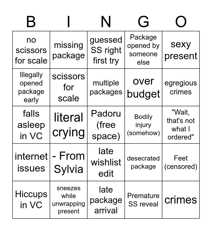 This bingo card has a free space and 26 words: late wishlist edit, Premature SS reveal, multiple packages, sneezes while unwrapping present, sexy present, no scissors for scale, Illegally opened package early, missing package, "Wait, that's not what I ordered", desecrated package, over budget, falls asleep in VC, Feet (censored), Hiccups in VC, literal crying, Feet (uncensored), Package opened by someone else, internet issues, guessed SS right first try, crimes, egregious crimes, late package arrival, Bodily injury (somehow), - From Sylvia, scissors for scale and James Henderson.