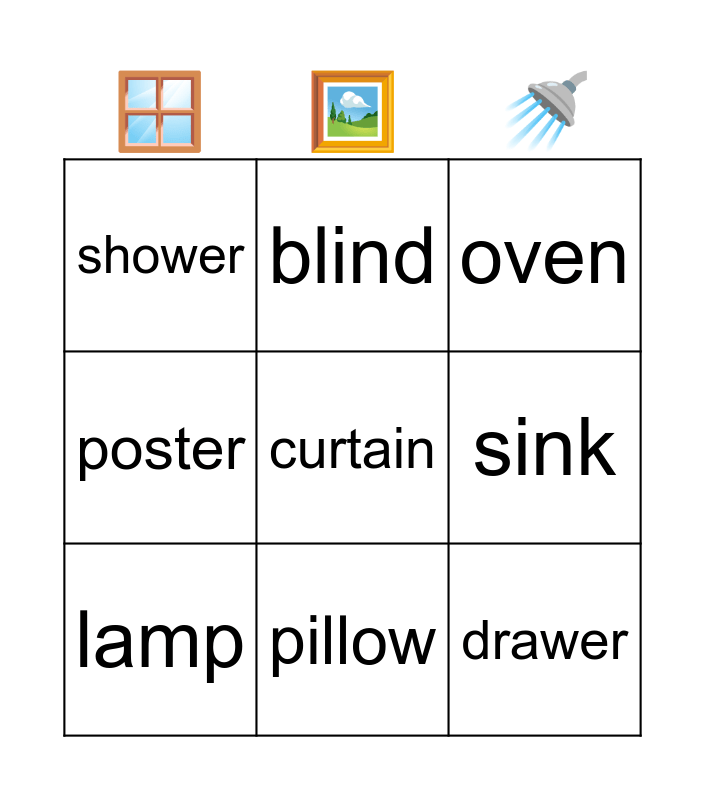 This bingo card has a free space and 8 words: sink, oven, blind, lamp, shower, drawer, poster and pillow.