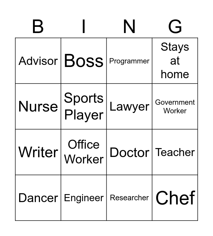 This bingo card has 16 words: Engineer, Teacher, Programmer, Advisor, Writer, Boss, Doctor, Researcher, Nurse, Sports Player, Dancer, Stays at home, Office Worker, Government Worker, Lawyer and Chef.
