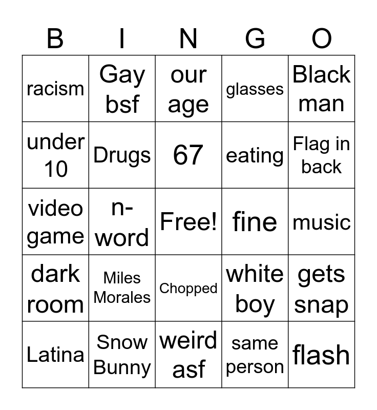 This bingo card has a free space and 24 words: Miles Morales, Snow Bunny, 67, Latina, Black man, racism, under 10, Gay bsf, fine, Chopped, eating, video game, white boy, gets snap, Drugs, same person, music, our age, Flag in back, n-word, flash, dark room, glasses and weird asf.