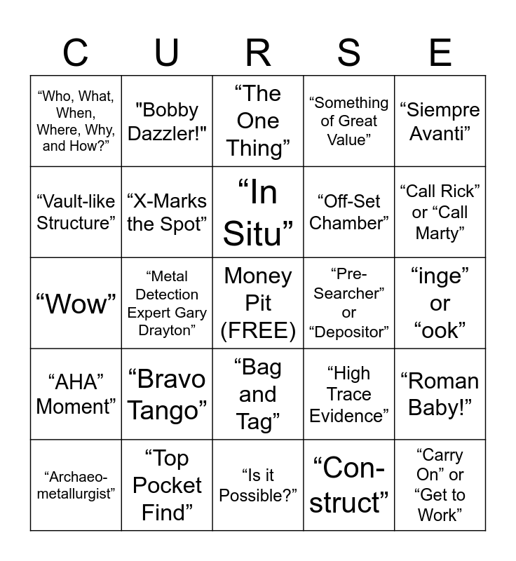 This bingo card has a free space and 29 words: “Archaeo-metallurgist”, “230-year-old Mystery”, “Metal Detection Expert Gary Drayton”, “Eyes and Boots”, “Who, What, When, Where, Why, and How?”, “The One Thing”, “X-Marks the Spot”, “Bravo Tango”, “Pre-Searcher” or “Depositor”, “Top Pocket Find”, “inge” or “ook”, “Carry On” or “Get to Work”, “Is it Possible?”, “Con-struct”, “Call Rick” or “Call Marty”, “It’s a Coin!”, “Bag and Tag”, “AHA” Moment”, “Siempre Avanti”, “Wow”, “High Trace Evidence”, “Could it Be?”, “Off-Set Chamber”, “Vault-like Structure”, “Something of Great Value”, "Bobby Dazzler!", “Roman Baby!”, “In Situ” and "Early 1700s".