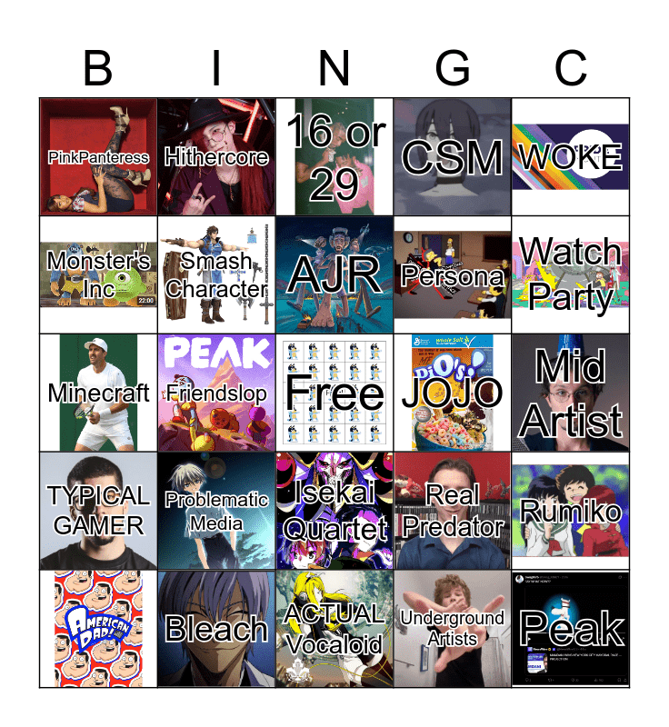 This bingo card has 24 images, a free space and 23 words: Problematic Media, Bleach, AJR, WOKE, PinkPanteress, Monster's Inc, Hithercore, JOJO, Isekai Quartet, Persona, Minecraft, Real Predator, Rumiko, Smash Character, Underground Artists, Mid Artist, 16 or 29, Watch Party, Friendslop, Peak, TYPICAL GAMER, CSM and ACTUAL Vocaloid.