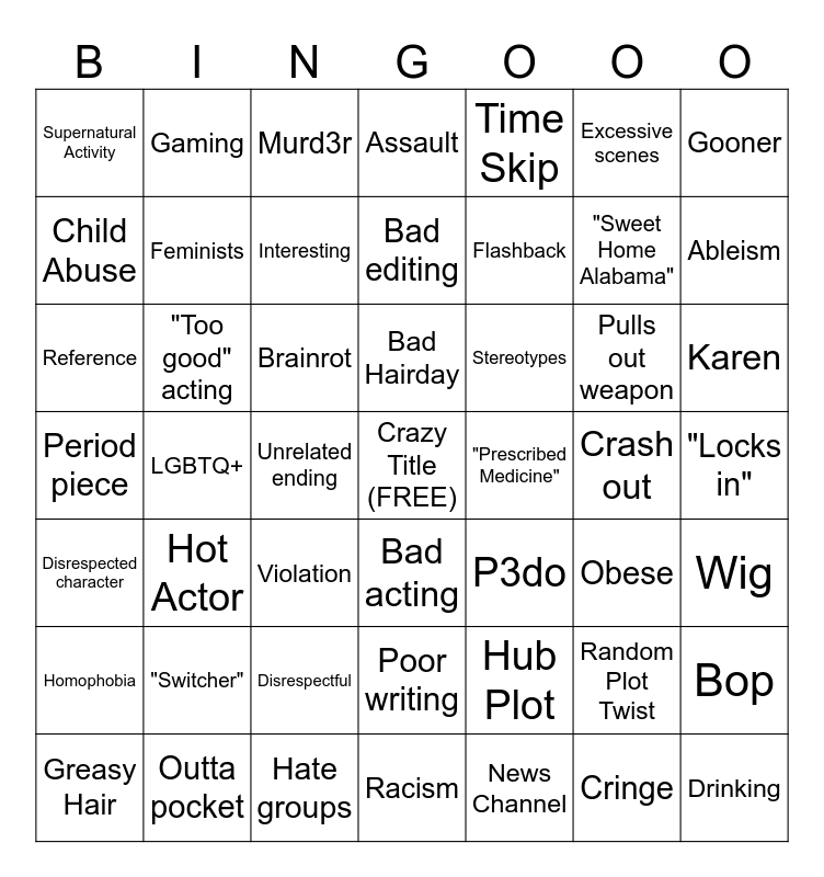 This bingo card has a free space and 48 words: Hub Plot, "Sweet Home Alabama", Racism, LGBTQ+, Brainrot, "Locks in", Gaming, Outta pocket, Excessive scenes, Bad acting, Gooner, Assault, Pulls out weapon, Stereotypes, Homophobia, Crash out, Child Abuse, Ableism, Random Plot Twist, Time Skip, Flashback, Unrelated ending, Supernatural Activity, Feminists, Bop, Interesting, Karen, Greasy Hair, Bad Hairday, "Too good" acting, Cringe, "Prescribed Medicine", Wig, "Switcher", Period piece, P3do, Obese, Reference, Violation, Disrespectful, Disrespected character, Drinking, Murd3r, Hate groups, Bad editing, Poor writing, Hot Actor and News Channel.