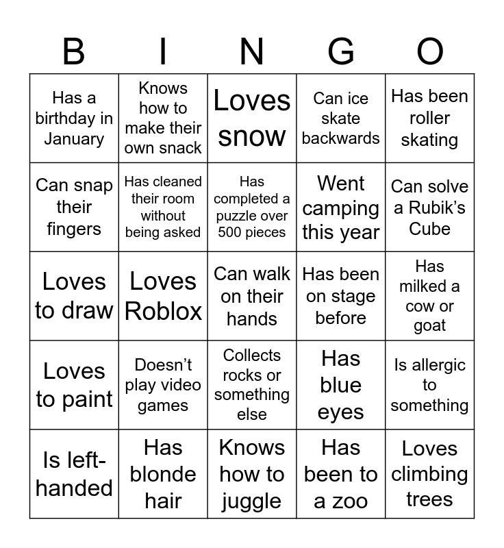 This bingo card has 199 words: Has a pet dog, Has a pet cat, Has no pets, Has a baby brother, Has a baby sister, Is an only child, Has more than 3 siblings, Was born in another state, Has traveled to another country, Went camping this year, Can ride a bike, Can do a cartwheel, Can whistle, Loves pizza, Doesn’t like pizza, Likes pineapple on pizza, Loves broccoli, Doesn’t like vegetables, Eats breakfast at school, Brings cold lunch to school, Rides the bus to school, Walks to school, Gets dropped off by car, Has brown hair, Has blonde hair, Has red hair, Has curly hair, Has straight hair, Has blue eyes, Has brown eyes, Wears glasses, Is left-handed, Is right-handed, Can speak more than one language, Loves math, Loves reading, Loves writing stories, Loves science, Loves social studies, Loves art class, Loves music class, Plays an instrument, Plays soccer, Plays basketball, Plays baseball or softball, Plays volleyball, Is in dance or gymnastics, Is in Scouts or 4-H, Likes to swim, Has been ice skating, Has been roller skating, Can ice skate backwards, Loves to draw, Loves to paint, Loves to color, Has been to a zoo, Has been to a museum, Has been on an airplane, Has been on a boat, Has ridden a horse, Likes sushi, Likes tacos, Loves French fries, Loves ketchup on everything, Likes spicy food, Doesn’t like chocolate, Loves ice cream, Likes vanilla ice cream best, Likes chocolate ice cream best, Likes mint ice cream, Has lost 8 or more teeth, Has braces, Can snap their fingers, Can tie their shoes, Can braid hair, Can make a paper airplane, Knows how to juggle, Can stand on one foot for 30 seconds, Can say the alphabet backwards, Can count to 100 in another language, Has a birthday in January, Has a birthday in the summer, Has a birthday on a holiday, Loves board games, Loves card games, Has completed a puzzle over 500 pieces, Loves reading mystery books, Loves graphic novels, Loves comics, Loves superhero movies, Has seen a movie more than 10 times, Loves Disney movies, Loves Harry Potter, Loves Minecraft, Loves Roblox, Loves Fortnite, Doesn’t play video games, Can code or wants to learn, Loves baking or cooking, Can crack an egg, Loves helping in the kitchen, Has their own garden, Has planted a seed and watched it grow, Loves animals, Has visited a farm, Has milked a cow or goat, Loves thunderstorms, Is afraid of thunder, Loves snow, Has built a snowman, Has sledded down a big hill, Loves summer more than winter, Loves winter more than summer, Has been to a beach, Built a sandcastle, Collected seashells, Loves hiking, Loves climbing trees, Has broken a bone, Has never broken a bone, Loves roller coasters, Is afraid of roller coasters, Likes to sing out loud, Has been in a play or musical, Has been on stage before, Has written a poem, Keeps a journal, Has a favorite stuffed animal, Sleeps with a nightlight, Can stay up past 10 PM, Has a bedtime earlier than 8 PM, Has their own phone or smartwatch, Loves LEGOs, Has built a LEGO set over 500 pieces, Loves puzzles or brainteasers, Knows how to play chess, Can solve a Rubik’s Cube, Has met a famous person, Has been to a concert, Has been to a professional sports game, Has been fishing, Knows how to skip rocks, Has held a frog or turtle, Is allergic to something, Has had stitches, Can do a magic trick, Knows how to sew or stitch, Has been in a wedding, Loves mornings, Loves staying up late, Prefers cats over dogs, Prefers dogs over cats, Loves stuffed animals, Loves scary stories, Loves funny movies, Can make someone laugh easily, Loves helping others, Has done a random act of kindness, Loves school, Loves recess the most, Loves lunch the most, Loves gym class, Has a favorite teacher they’ll never forget, Has a favorite book series, Has read more than 20 books this year, Has visited a library recently, Loves art museums, Has been to a state fair, Has ridden a Ferris wheel, Loves cotton candy, Has been camping in a tent, Has roasted marshmallows, Loves hot chocolate, Knows how to play checkers, Can play Go Fish, Knows how to shuffle cards, Loves solving riddles, Can do a handstand, Can do the splits, Can hula hoop, Can jump rope 20 times in a row, Loves playing tag, Can run fast, Can walk on their hands, Loves nature walks, Collects rocks or something else, Loves rainbows, Has seen a shooting star, Has made a wish on a birthday candle, Loves helping younger kids, Has cleaned their room without being asked, Knows how to make their own snack, Loves dinosaurs, Loves outer space, Wants to be a teacher someday, Wants to be a scientist someday, Wants to be an artist someday, Wants to be an athlete someday and Wants to help people when they grow up.