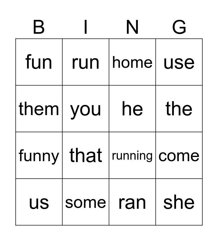 This bingo card has 16 words: some, come, home, fun, funny, run, running, ran, them, you, us, use, that, the, he and she.