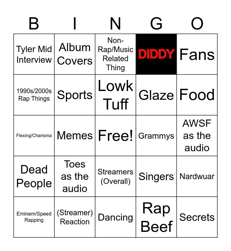 This bingo card has a free space and 29 words: Eminem/Speed Rapping, Concert, Memes, Travis Scott, Tyler Mid Interview, Non-Rap/Music Related Thing, Sports, Toes as the audio, Grammys, (Streamer) Reaction, AWSF as the audio, Secrets, Dancing, Rap Beef, Food, Unusual/Weird, Streamers (Overall), Dead People, Fans, Flexing/Charisma, Singers, NEW, Glaze, 1990s/2000s Rap Things, DIDDY, Album Covers, Nardwuar, Lowk Tuff and Random Celebrity Opinions.