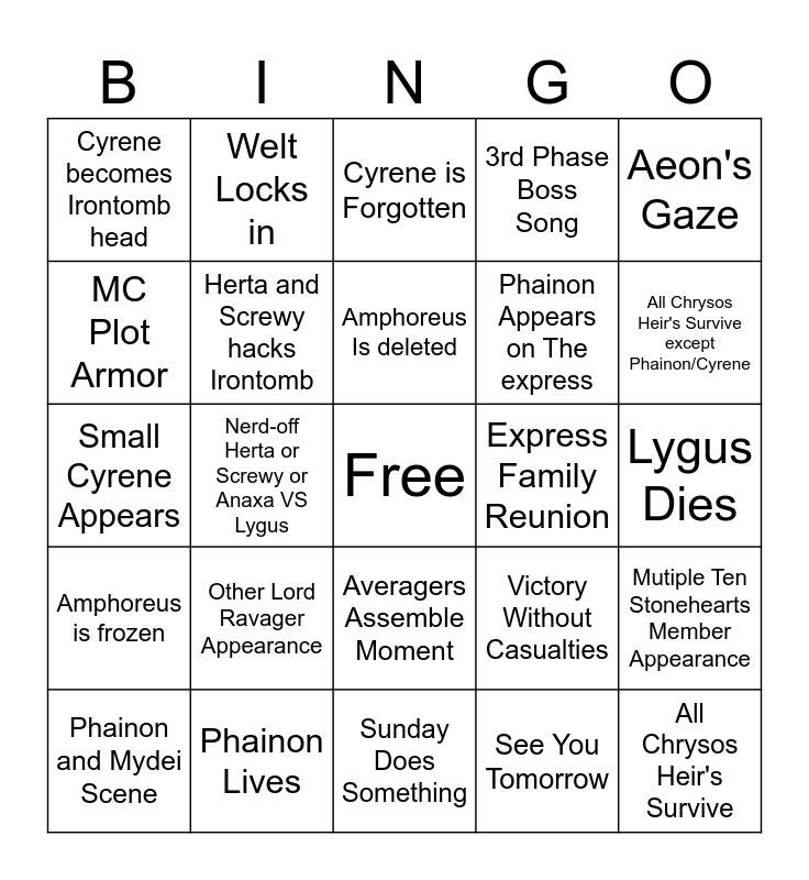 This bingo card has a free space and 24 words: Other Lord Ravager Appearance, Phainon Lives, Amphoreus Is deleted, Phainon and Mydei Scene, Aeon's Gaze, Cyrene becomes Irontomb head, MC Plot Armor, Welt Locks in, Express Family Reunion, Averagers Assemble Moment, Phainon Appears on The express, Small Cyrene Appears, Victory Without Casualties, Mutiple Ten Stonehearts Member Appearance, Herta and Screwy hacks Irontomb, See You Tomorrow, Lygus Dies, Cyrene is Forgotten, All Chrysos Heir's Survive except Phainon/Cyrene, Nerd-off Herta or Screwy or Anaxa VS Lygus, All Chrysos Heir's Survive, Amphoreus is frozen, 3rd Phase Boss Song and Sunday Does Something.