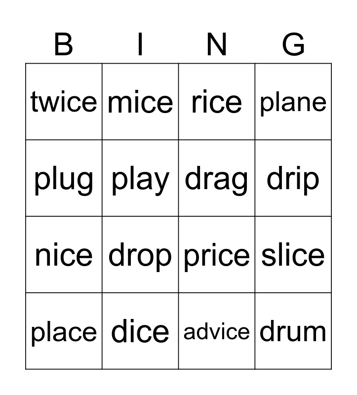 This bingo card has 16 words: dice, slice, rice, twice, nice, mice, price, advice, plug, play, place, plane, drop, drip, drag and drum.