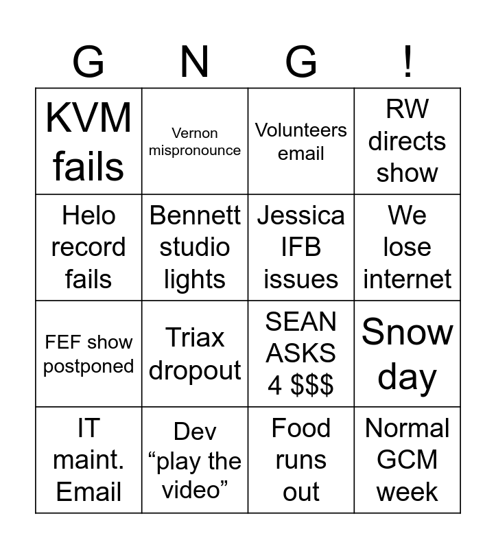 This bingo card has 26 words: JW CVS bathroom, Parking gate broken, We lose internet, Gary is wrong, Helo record fails, KVM fails, Bennett studio lights, Vernon mispronounce, Food runs out, Sales channel email, FEF show postponed, SEAN ASKS 4 $$$, JW beats KB to work, No GP pre record, Snow day, 10 game win streak, RW directs show, Normal GCM week, Volunteers email, IT maint. Email, Triax dropout, New intro video, Dev “play the video”, CJ takes shirt off, Jessica IFB issues and Utility runs late.
