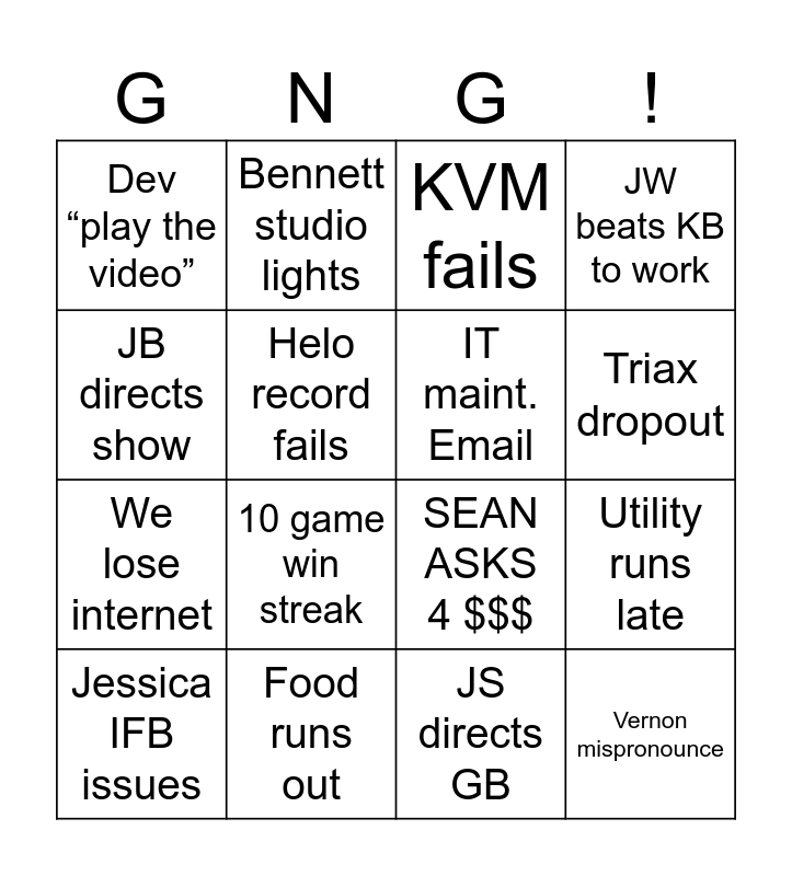 This bingo card has 28 words: JW CVS bathroom, Parking gate broken, We lose internet, Gary is wrong, Helo record fails, KVM fails, Bennett studio lights, Vernon mispronounce, Food runs out, FEF show postponed, SEAN ASKS 4 $$$, JW beats KB to work, No GP pre record, Snow day, 10 game win streak, Normal GCM week, Volunteers email, IT maint. Email, Triax dropout, New intro video, Dev “play the video”, CJ takes shirt off, Jessica IFB issues, Utility runs late, JS directs GB, RW directs show, JB directs show and Sales channel email.