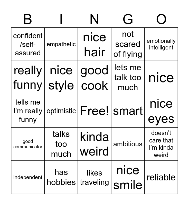 This bingo card has a free space and 24 words: talks too much, has hobbies, good cook, independent, emotionally intelligent, confident /self-assured, really funny, empathetic, smart, kinda weird, lets me talk too much, tells me I’m really funny, ambitious, doesn’t care that I’m kinda weird, nice style, nice smile, nice eyes, nice hair, nice, optimistic, reliable, good communicator, not scared of flying and likes traveling.